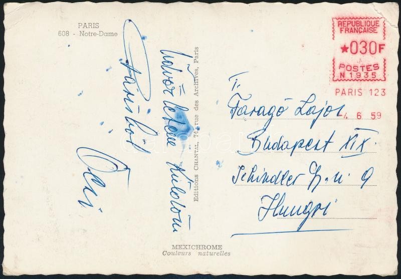 Beschreibung: 1959 Puskás Ferenc (1927-2006) labdarúgó Párizsból küldött üdvözlő sorai és aláírása Faragó Lajos (1932- ) labdarúgó, edző részére levelezőlapon