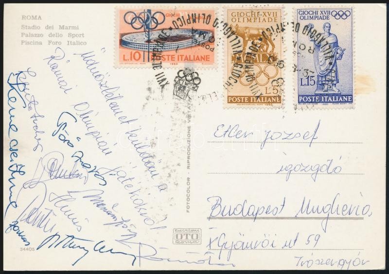 1960 Római Olimpiáról küldött képeslap Kemecsei Imre, Törő András, Mészáros György, és más magyar olimpikonok aláírásával / Hungarian olympic champions autograph signed postcard