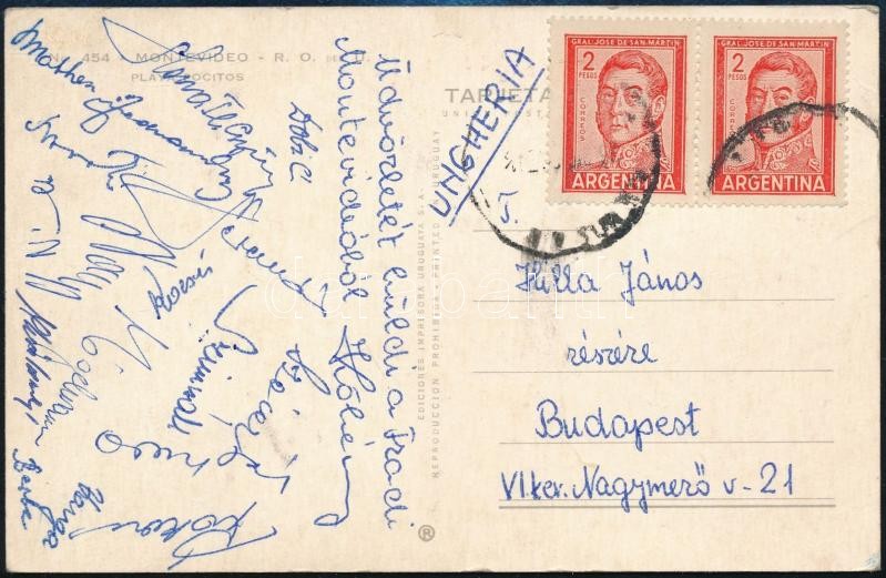 1961 A Ferencváros focicsapat dél-amerikai vendégjátékáról hazaküldött képeslap a csapat tagjainak aláírásával, plusz 3 vendégjátékos aláírásával / 1961 FTC Hungarian football team in Argentina, autograph signed postcard with 3 guest players.