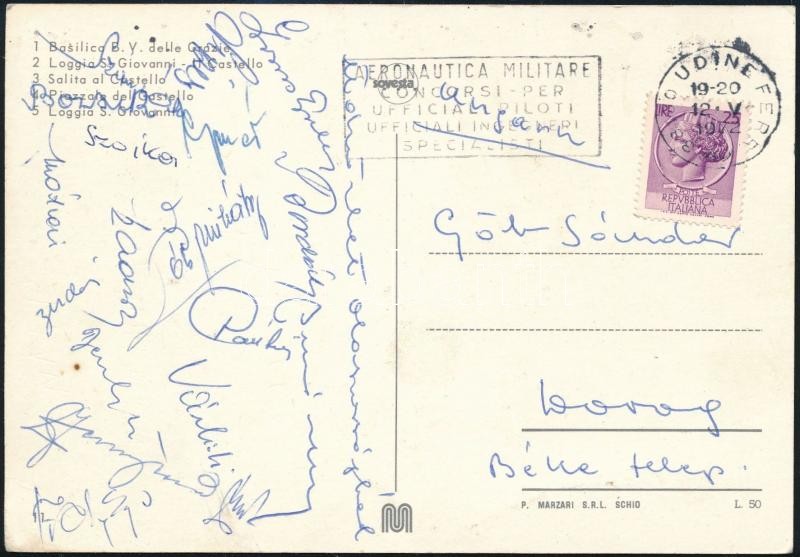 1972 Legendás magyar labdarúgókból álló öregfiúk csapat tagjainak aláírásai Olaszországból: Grosics, Hidegkuti, Szojka, Mátrai, Bozsik, Zsengellér és mások / Autograph signatures of Hungarian football players from a senior match in Italy.
