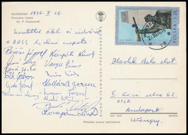 Beschreibung: 1976 Birkózók aláírásai lengyel levelezőlapon, köztük olimpiai bajnokok is: Kárpáti Károly, Pércsi József, Varga János, Goda József, stb.
