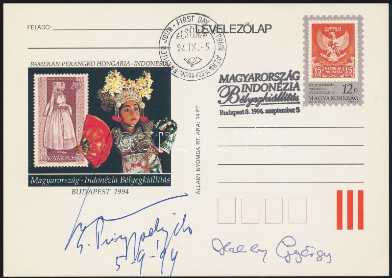 1994 Magyarország-Indonézia nemzetközi bélyegkiállítás FDC, rajta Habsburg György és az Soelaeman Pringgodigdo budapesti indonéz nagykövet aláírásával / Hungary-Indonesia international stamp exhibition FDC with autograph signature of Georg von Habsburg and Soelaeman Pringgodigdo