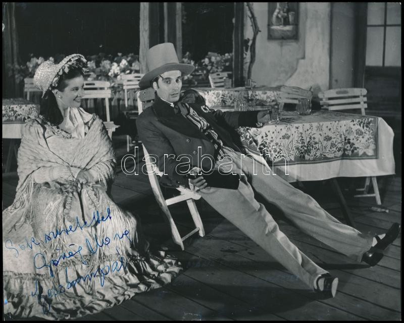 Beschreibung: Görög Márta és Beszterczei Pál színészek aláírása színházi standfotón
