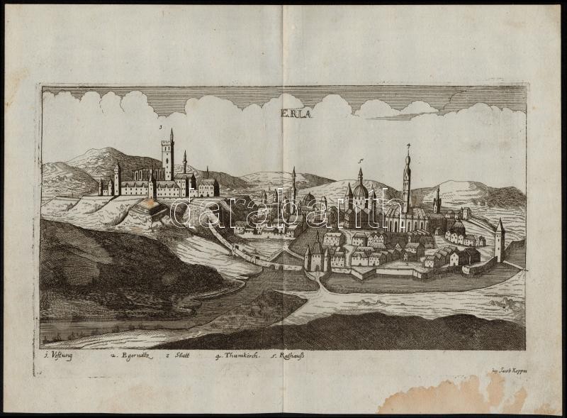 Eger - Erla Jacob Koppmayer, rézmetszete. A kép alatt jelmagyarázat. Megjelent: J. Ch. Wagner: Delineatio Provinciarum Pannoniae... (Augsburg, 1684.) Képméret: 17,2×31,7 cm. Lapméret: 31,4×38,5 cm