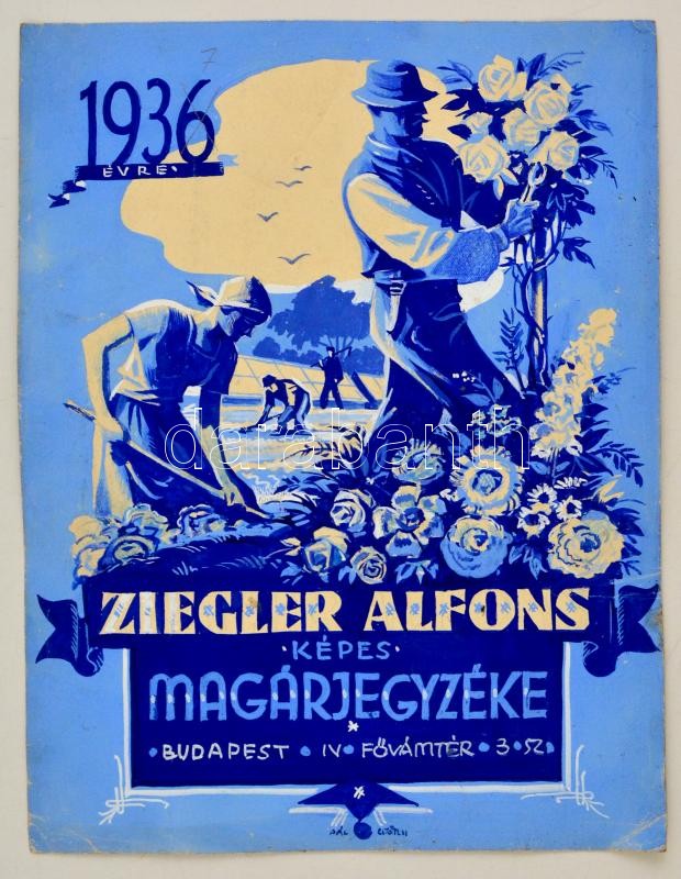 cca 1936 Pál György (1906-1986): Ziegler Alfonz képes magárjegyzéke.. Pecséttel jelzett Globus nyomdás terv. Akvarell, papír / Advertising. Watercolor. 48x3 cm