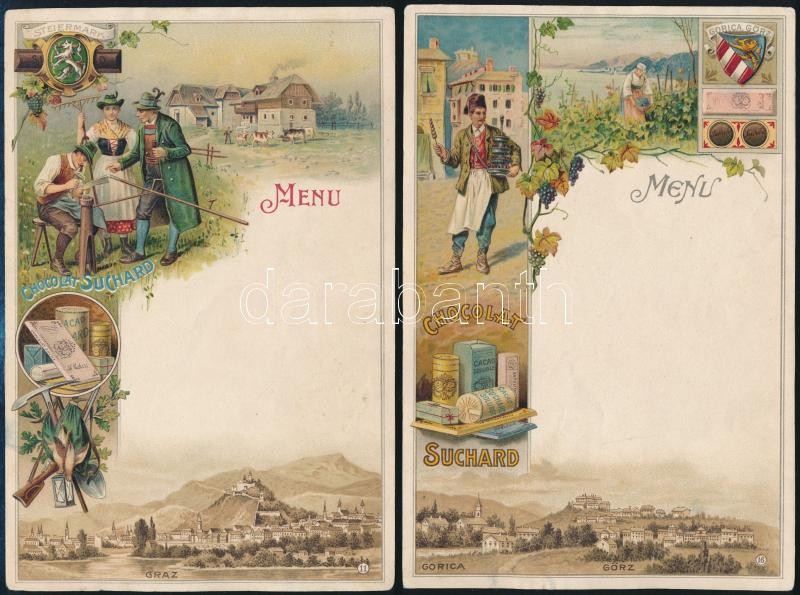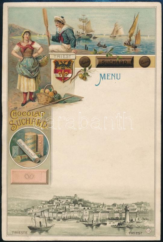cca 1900 Chocolat Suchard, kitöltetlen menükártya, színes litográfia, trieszti, goriziai és grazi motívummal /