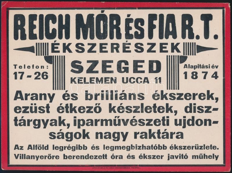 cca 1940 Szeged, Reich Mór ékszerész reklám tábla / cégtábla. Karton.... https://www.darabanth.com/de/30-Gross-Auktion/30.1/Andere-Sammelgebiete/Werbungen~12190/cca-1940-Szeged-Reich-Mor-ekszeresz-reklam-tabla-cegtabla-Karton-24x18-cm~II1861917