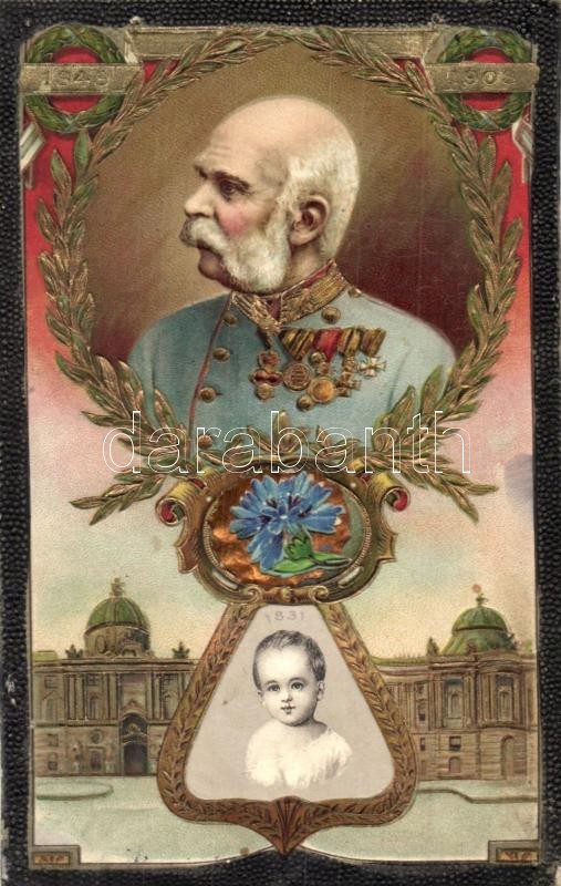 1848-1908 Ferenc József uralkodásának 60. évordulója. Jubileumi díszes, szecessziós, dombornyomott litho mechanikus lap (nem működik!) / Franz Joseph's 60th anniversary of reign. Art Nouveau, Emb. litho mechanical postcard (does not work!) (r)