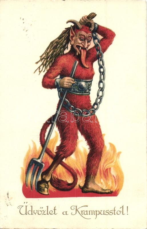 1926 Üdvözlet a Krampusztól! / Krampus greeting art postcard with pitc... https://www.darabanth.com/de/30-Gross-Auktion/30.1/Ansichtskarten/Krampus~12588/1926-Udvozlet-a-Krampusztol-Krampus-greeting-art-postcard-with-pitchfork-litho~II1861711