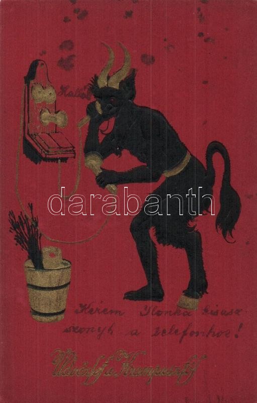 Üdvözlet a Krampusztól! / Krampus on the phone. Emb. K.Ph.W. II. 34. ... https://www.darabanth.com/de/30-Gross-Auktion/30.1/Ansichtskarten/Krampus~12588/Udvozlet-a-Krampusztol-Krampus-on-the-phone-Emb-KPhW-II-34-EK~II1839340