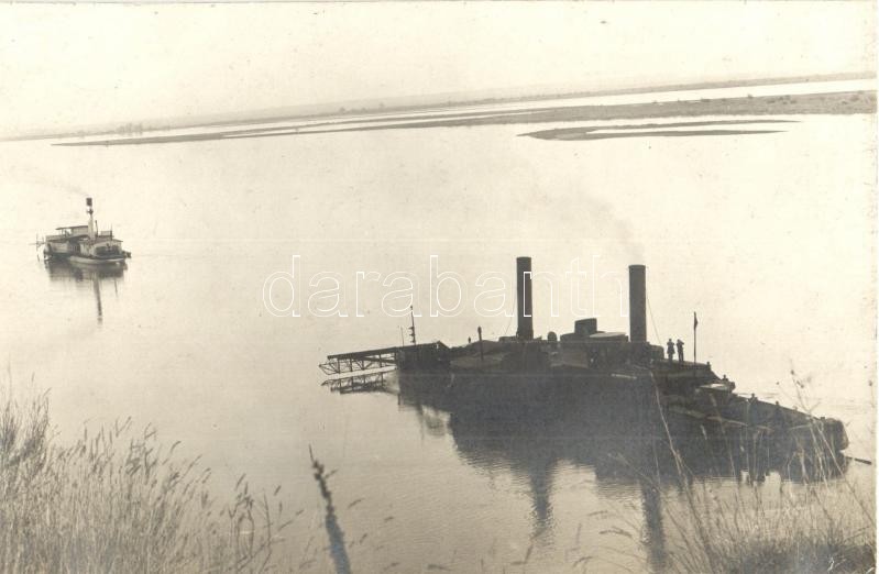 1914 Háborúban felfegyverzett Sámson aknaszedő gőzös Pancsovánál, előtte a Kulpa kórházhajó; Dr. Réti amateur felvétele; Dunai Flottila / K.u.K. Kriegsmarine, armed SS Samson minesweeper with "Kulpa" hospital ship, photo (gluemark on backside)