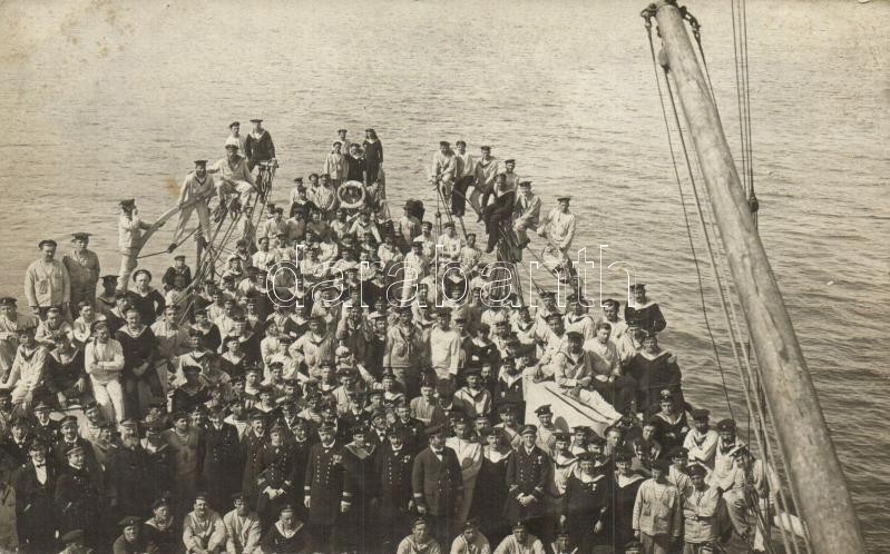 Beschreibung: 1915 SMS Helgoland Osztrák-Magyar Haditengerészet gyorscirkáló tisztjei, legénysége, matrózok csoportképe / K.u.K. Kriegsmarine, Naval officers and mariners of SMS helgoland. group photo + "K.u.K. Kriegsmarine SMS Helgoland"