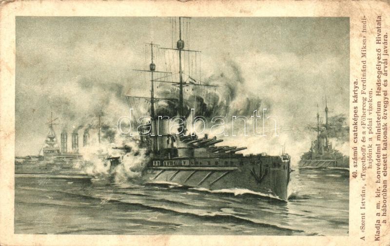 1916 40. számú csataképes kártya. Szent István, Tegethoff és Főherceg Ferdinánd Miksa hadihajók a polai vizeken. Hadsegélyező Hivatal kiadása / WWI K.u.K. Kriegsmarine. SMS Szent István, SMS Tegethoff and SMS Archduke Ferdinand Maximilian + "Szilágyfőkeresztúr Postai Ügyn." (EK)