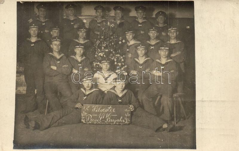 1916 Silvester, Prosit Neujahr! K.M. Werft. Division und K.M. Torpedo. Division / WWI German (Kaiserliche Marine) Navy, mariners' group photo at New Year's Eve with Christmas tree. photo