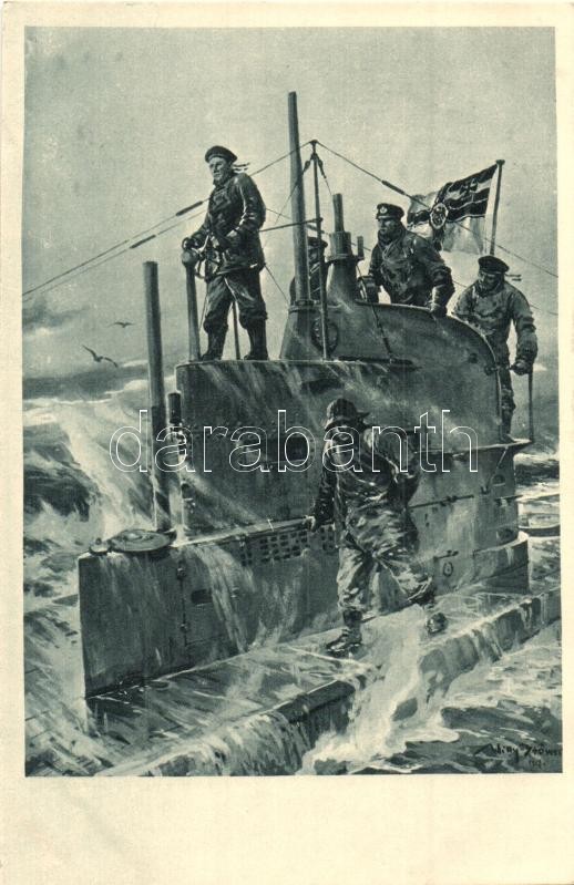 Beschreibung: Auf dem Kommandoturm eines U-Bootes. Offizielle Postkarte U-Boot-Tag Juni 1917 / WWI German submarine s: Willy Stöwer