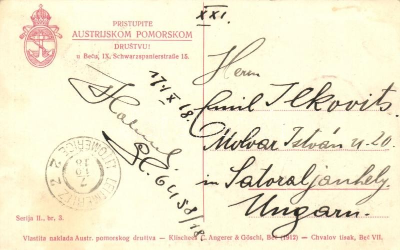 Beschreibung: SMS Wien osztrák-magyar Monarch-osztályú partvédő csatahajó / Nj. V. braniteli primorja Wien. Austrijskom Pomorskom Serija II. br. 3. / K.u.K. Kriegsmarine SMS Wien. TCV card s: Alex. Kircher