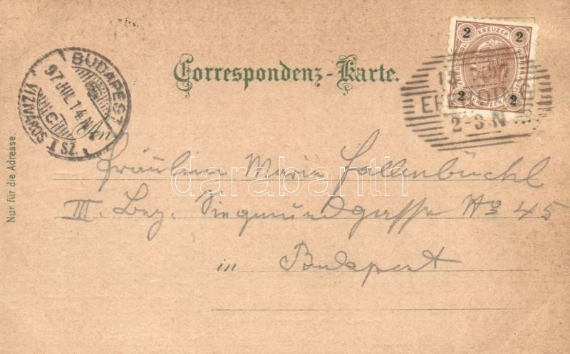 1897 (Vorläufer!) Eferding, Starhembergstrasse, Hauptplatz, Schloss, Aussichtswarte a. d. Mayerhofer Berg / street, square, castle, look out tower. Karl Schwidernoch Art Nouveau, floral, litho