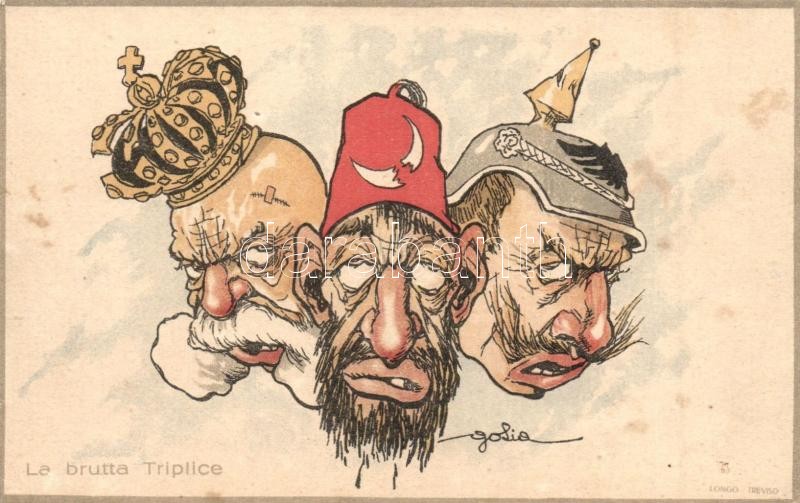 Beschreibung: La brutta Triplice / WWI Italian anti-Triple Entente military porpaganda art postcard. Casa Editrice Longo, litho s: Golia