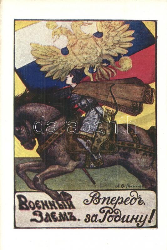 Beschreibung: Military loan. Forward to the Motherland! Affiches de la Grande Guerre No. 9. / WWI Russian Tsarist war loan propaganda art postcard s: Maximov