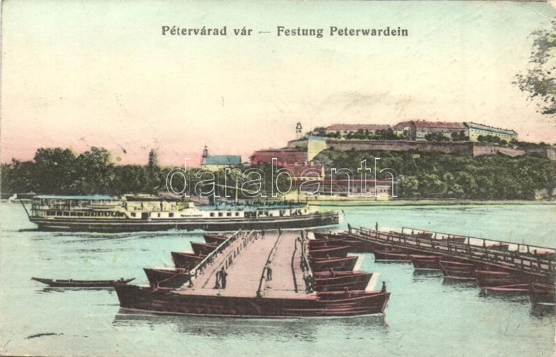 Tegetthoff gőzüzemű oldalkerekes személyhajó a péterváradi hajóhíddal, vár / Hungarian passenger steamship in Petrovaradin, pontoon bridge and castle (EK)