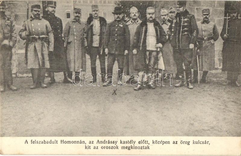 Homonna, Homenau, Humenné; A felszabadult város az Andrássy kastély előtt, középen az öreg kulcsár, akit az oroszok megkínoztak / the end of occupation in front of the castle, the housekeeper who was tortured by the Russians (EK)