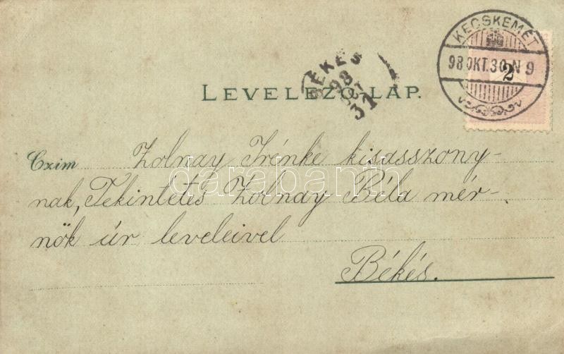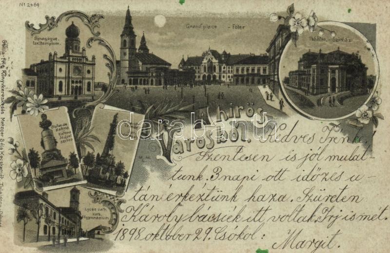 1898 Kecskemét, Fő tér, Zsinagóga, színház, Katona József és Szentháromság szobor, Katolikus főgimnázium, floral, litho; Gallia féle könyvkereskedés Metzger Béla kiadása