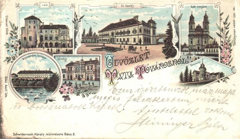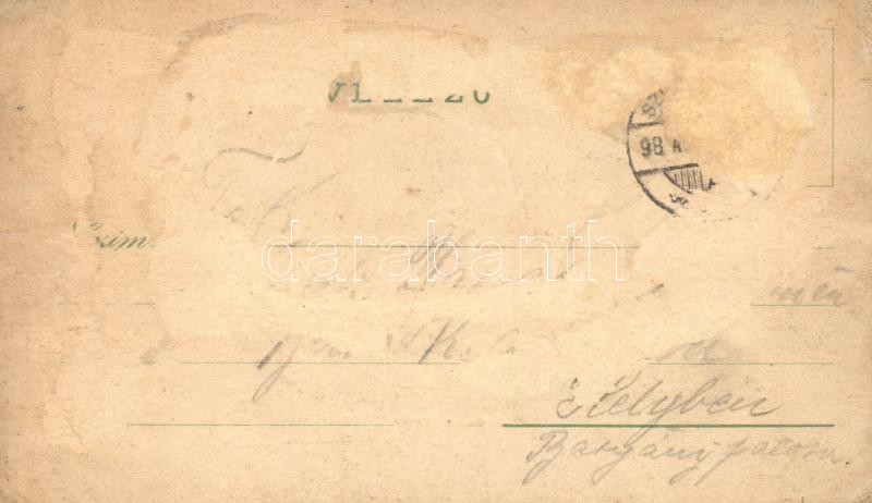 Beschreibung: 1898 Tatatóváros, vár, kastély, katolikus templom, remeteség, városház, Kegyesrendiek társháza. Schwidernoch Károly floral, litho (r)