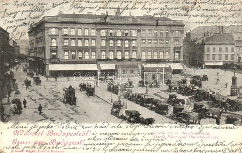 Beschreibung: 1900 Budapest V. Gizella tér (Vörösmarty tér), Kereskedelmi Bank, Takarékpénztár, Singhoffer Béla üzlete, piac (kopott sarkak / worn corners)