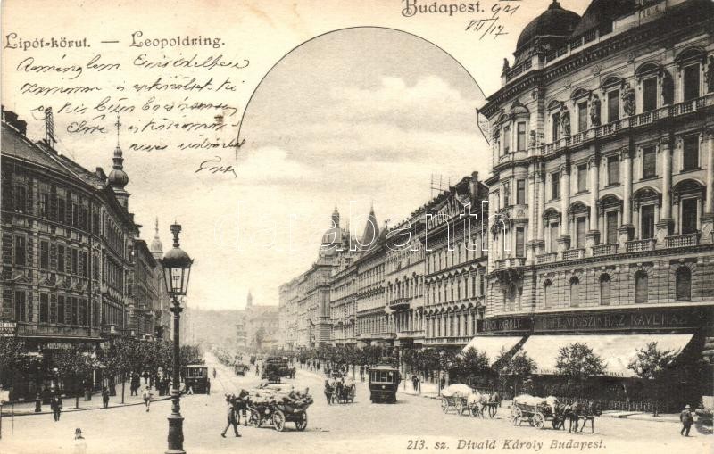 Beschreibung: 1901 Budapest XIII. Lipót körút, Café Vígszínház kávéház, Sturm József Pilseni Sörcsarnoka, Gyógyszertár, villamos, kerékpár, üzletek