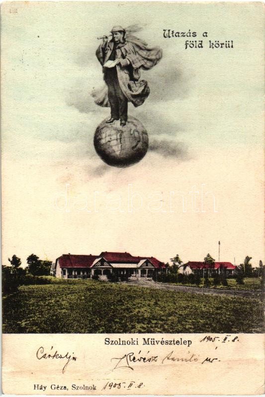 1905 Szolnok, Művésztelep. Utazás a föld körül montázslap földgömbön á... https://www.darabanth.com/de/30-Gross-Auktion/30.1/Ansichtskarten/Ungarn~12505/1905-Szolnok-Muvesztelep-Utazas-a-fold-korul-montazslap-foldgombon-allo-urral-Hay-G~II1731964