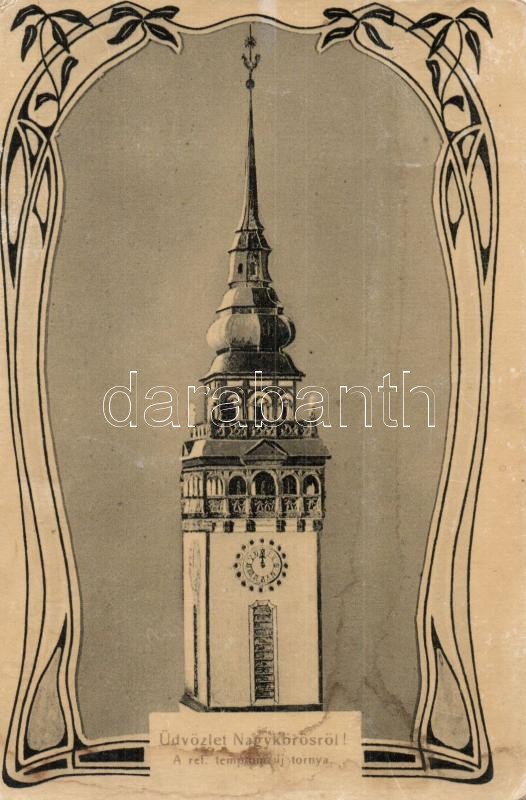 Beschreibung: 1908 Nagykőrös, Református templom új tornya. Geszner Jenő kiadása. Art Nouveau (fl)