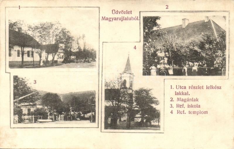 Beschreibung: 1914 Magyarújfalu (Kétújfalu, Teklafalu), utca, lelkész lak, Magánlak, Református templom és iskola