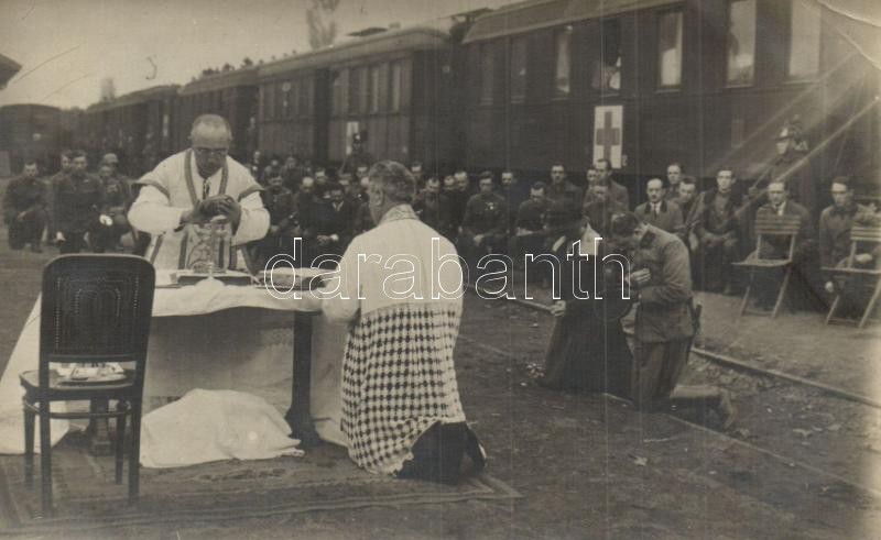 1923 Biatorbágy, vasútállomás, Vöröskeresztes kórházvonat, IV. Károly és Zita királyi pár utolsó útja Magyarországra, tábori mise / The last visit of Charles I of Austria and Zita to Hungary, field prayer at the railway station, Red Cross hospital train. photo (EK)