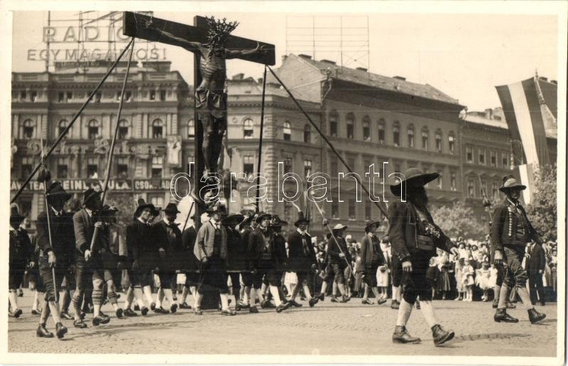 Beschreibung: ~1930 Budapest VI. Oktogon tér, Meinl Gyula kávé, tea és csokoládé üzlete, felvonulás keresztre feszített Jézus szoborral. photo