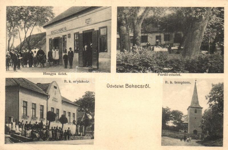 Bekecs, Római katolikus templom és népiskola, fürdő, Hangya üzlet és b... https://www.darabanth.com/de/30-Gross-Auktion/30.1/Ansichtskarten/Ungarn~12505/Bekecs-Romai-katolikus-templom-es-nepiskola-furdo-Hangya-uzlet-es-bor-sor-es-palinka-m~II1862107