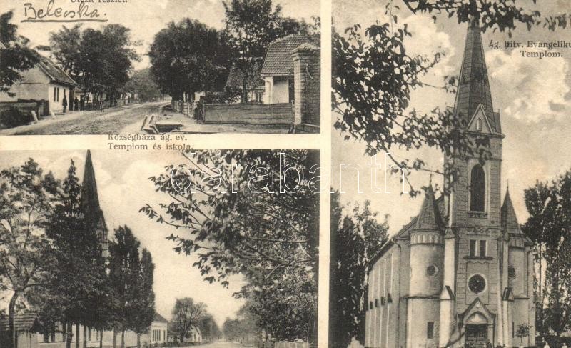 Beschreibung: Belecska, utca, Ágostai hitvallású evangélikus templom és iskola, községháza, utcaképek