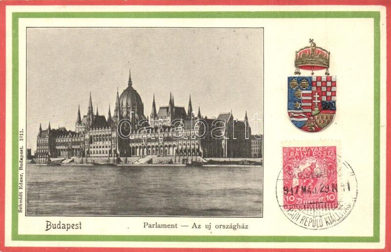 Beschreibung: Budapest V. Országház. Magyar zászlós és címeres dombornyomott lap. Emb. "1917 Budapest Hadirepülő Kiállítás" So. Stpl