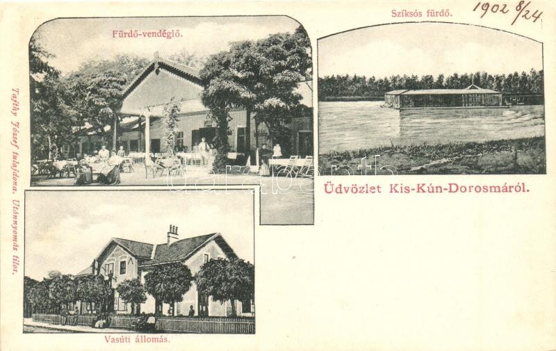 Beschreibung: Kiskundorozsma, Fürdő vendéglő, Sziksós fürdő, vasútállomás; Tajthy József tulajdona