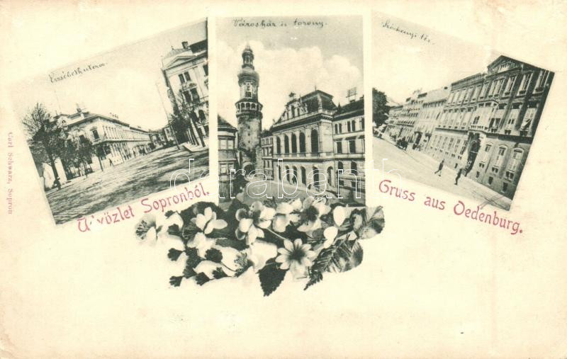 Sopron, Oedenburg; Erzsébet utca, Városháza, torony, Széchenyi tér, Ca... https://www.darabanth.com/de/30-Gross-Auktion/30.1/Ansichtskarten/Ungarn~12505/Sopron-Oedenburg-Erzsebet-utca-Varoshaza-torony-Szechenyi-ter-Carl-Schwarz-floral~II1487908