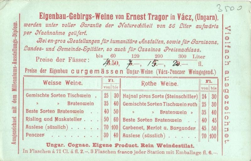 Beschreibung: Vác, Tragor Ernő (Ernest Tragor) szőlőbirtoka, csörögi pincészete és kúriája. Német nyelvű reklámlap árjegyzékkel a hátoldalon (EK)