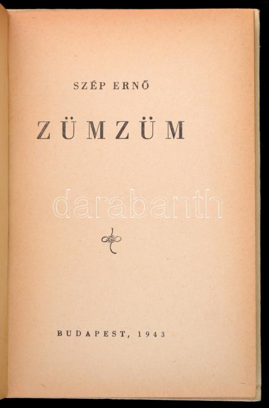 Szép Ernő: Zümzüm. Bp., 1943, (May János Nyomdai Műintézet Rt.-ny.), 119 p. Első kiadás. Kiadói, illusztrált vászonkötésben, jó állapotban. Számozott (200/158.) és a szerző által aláírt példány.