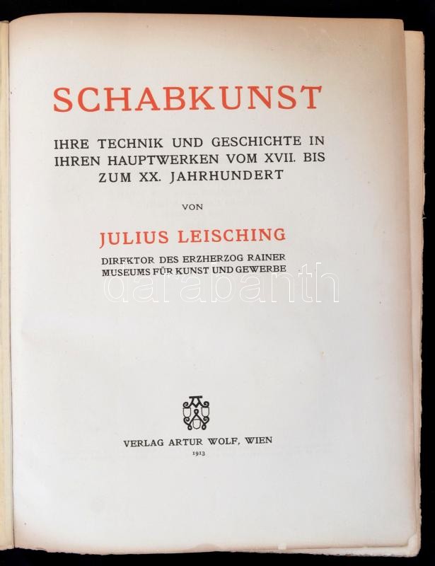 Leisching, Julius.:Schabkunst. Ihre Technik und Geschichte in ihren Hauptwerken vom XVII. bis zum XX. Jahrhundert. Wien, 1913. Verlag Artur Wolf, Könyv a rézmetszésről, rézkarcolásról. 75 heliogravűr táblával. Sorszámozott 227/350 példány. Aranyozott lapszélekkel, gerincén kissé sérült pergamen kötésben. / Book about the technics of etchings. With 75 heliogravures. Numbered 227/350. In slightly damaged pergamin binding.