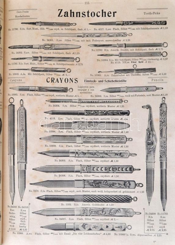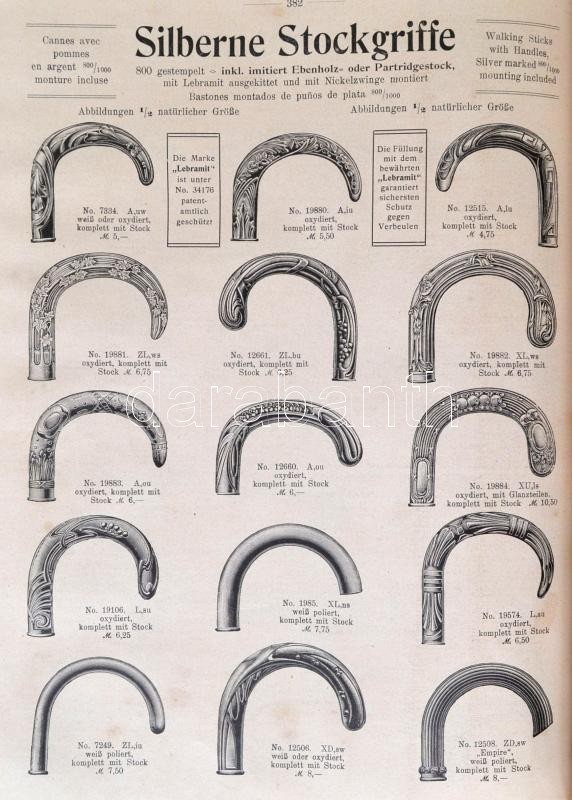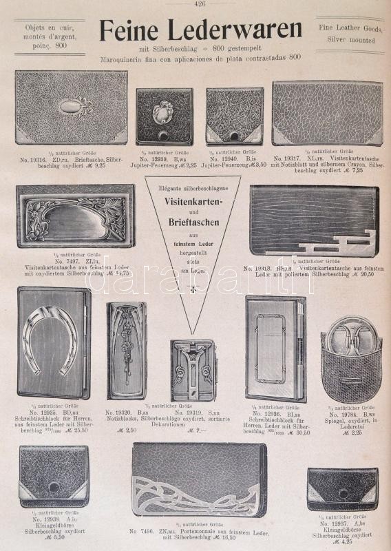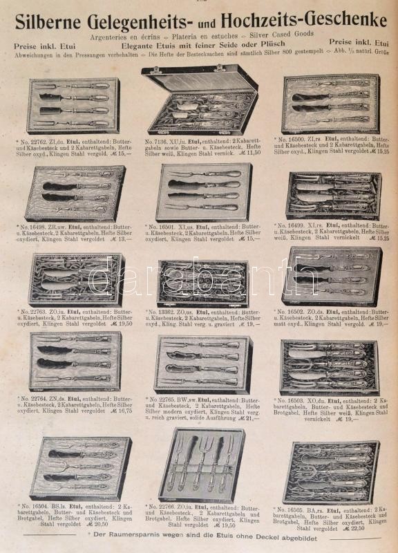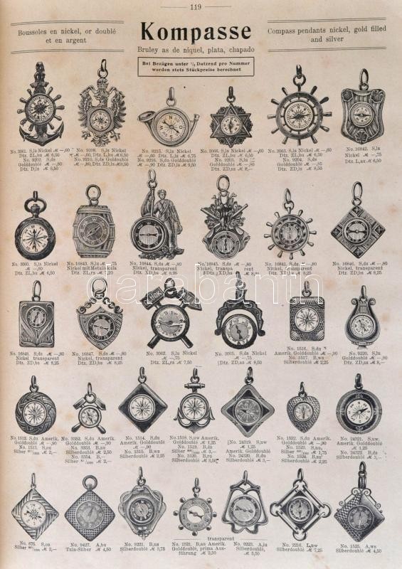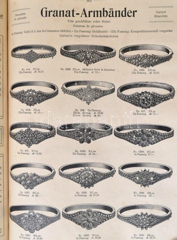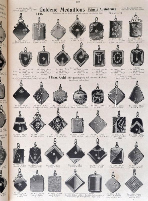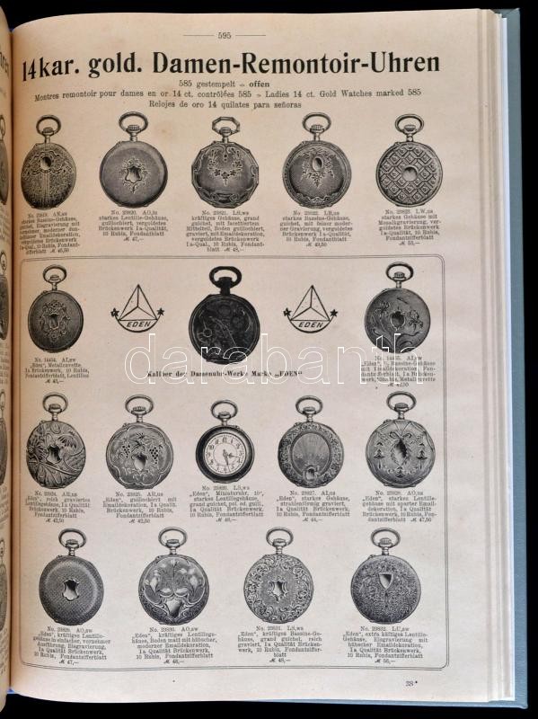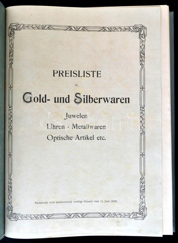 cca 1911 Preisliste für Gold- und Silberwaren. Juwelen, Uhren, Metallwaren, Optische Artikel. 1910-1911. Több nyelvű arany és ezüstárú katalógus, 704 p. Átkötött modern kötésben, az eredeti papírborítót az átkötéskor felhasználták, jó állapotban./ cca 1911 Price list for Gold- and Silverware, Jewels, Clocks, Metalwares, and Optical Items. In multiple langauage. Rebound modern-binding, in good condition.