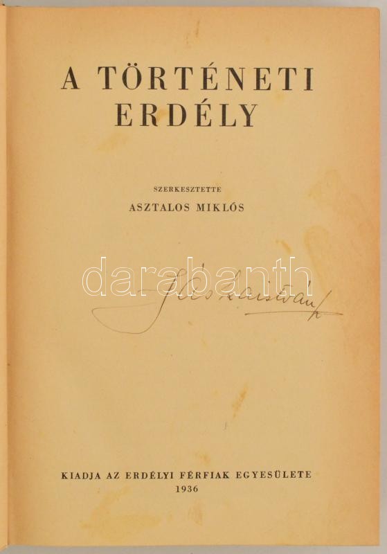 A történeti Erdély. Gróf Teleki Pál előszavával. Szerk.: Asztalos Miklós. [Bp.], 1936, Erdélyi Férfiak Egyesülete, 739+1 p.+64 t. Egészoldalas fekete-fehér táblákkal, és szövegközti és egészoldalas fekete-fehér illusztrációkkal. Kiadói egészvászon kötés, számos képpel, illusztrációval. Jó állapotban.