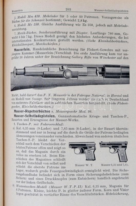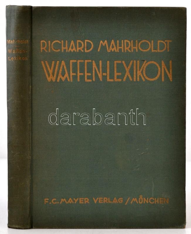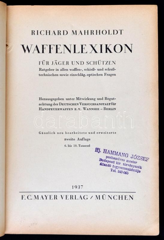 Richard Mahrholdt: Waffenlexikon für Jäger und Schützen. München, 1937, F.C. Mayer. Második kiadás. Német nyelven. Kiadói aranyozott egészvászon-kötés, a hátsó szennylap hiányzik, a hátsó kötéstábla belseje foltos. Ifj. Hammang József puskaműves mester névbélyegzőjével./Linenbinding, with lost back smear-sheets, the back cover spotty inside.