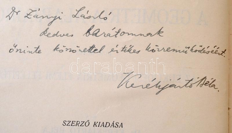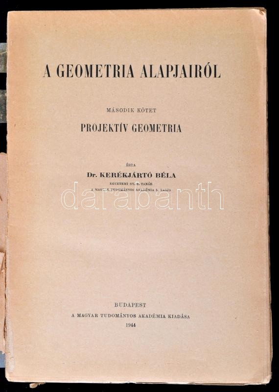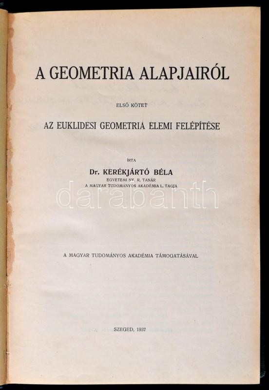 Dr. Kerékjártó Béla: A geometria alapjairól. I. kötet: Az euklidesi geometria elemi felépítése. II. kötet: Projektív geometria. Szeged-Bp., 1937-1944, Szerzői kiadás-MTA. Kiadói kopottas egészvászon-kötés, és kiadói papírkötés, a második kötet megviselt állapotban, a papírborító sérült, szakadt, a könyvtest laza, kissé sérült, a könyvtest elvált a borítótól. Ritka! Az első kötetet a szerző, Dr. Kerékjártó Béla (1898-1946) matematikus egyetemi tanár által Dr. Zányi László (1905-?) piarista matematika, és fizika szakos tanár részére dedikált példány.