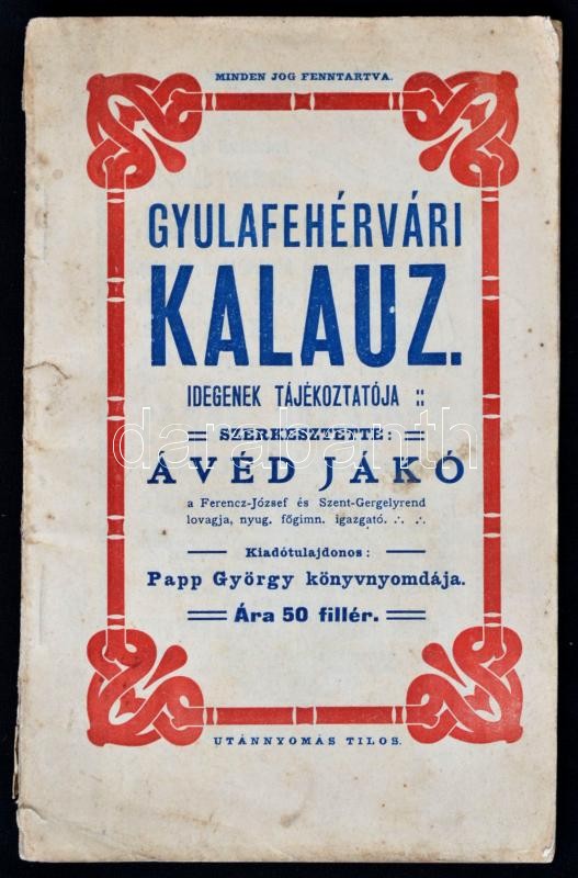 Gyulafehérvári kalauz. Szerk.: Avéd Jákó. Gyulafehérvár, 1909, Papp György-ny., 80 p. Korabeli reklámokkal. Kiadói papírkötés, szakadozott gerinccel./ Guide of Alba Iulia (Karlsburg/Gyulafehérvár). Edited by Jákó Avéd. Alba Iulia, 1909, György Papp, 80 p. WIth adds. Paperbinding,