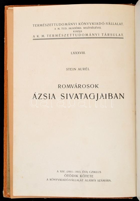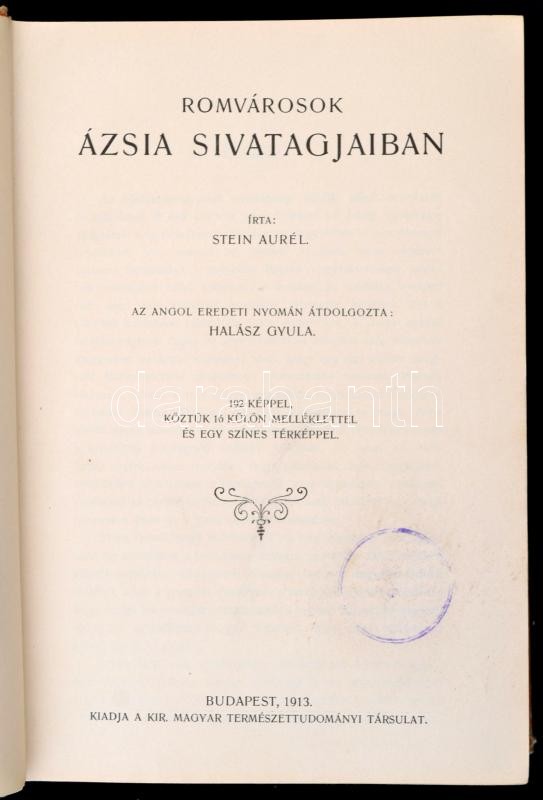 Stein Aurél: Romvárosok Ázsiai sivatagjaiban. Fordította: Halász Gyula. Természettudományi Könyvkiadó Vállalat LXXXVIII. kötete. Bp.,1913, M. Kir. Természettudományi Társulat,("Pátria"-ny.), IX+2+667 p.+ 16 t. + 1 különálló térképmelléklet a végénél beillesztve. Kiadói festett egészvászon-kötés, Gottermayer-kötés, kopottas borítóval, intézményi bélyegzővel, a térképen a hajtások mentén kis szakadások, ex libris-szel. Sassy Attila (Aiglon) (1880-1967): Ex libris Zsók. Klisé, papír, jelzett a klisén, 7x7 cm.