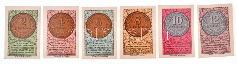 Beschreibung: Budapest 1916. 2f + 4f + 6f + 8f + 10f + 12f "Hadsegélyező Hivatal" T:I / Hungary / Budapest 1916. 2 Fillér + 4 Fillér + 6 Fillér + 8 Fillér + 10 Fillér + 12 Fillér "Hadsegélyező Hivatal (Military Aid Office)" C:UNC
