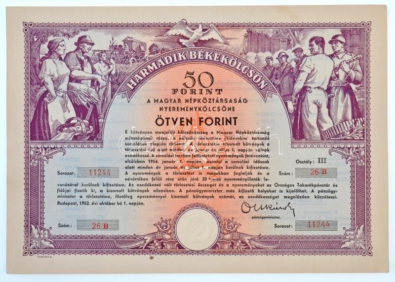 Beschreibung: Budapest 1952. "Harmadik Békekölcsön" nyereménykölcsön 50Ft-ról, szárazpecséttel T:I- / Hungary / Budapest 1952. "Harmadik Békekölcsön (Third Peace Loan)" lottery loan ticket about 50 Forint, with embossed stamp C:AU